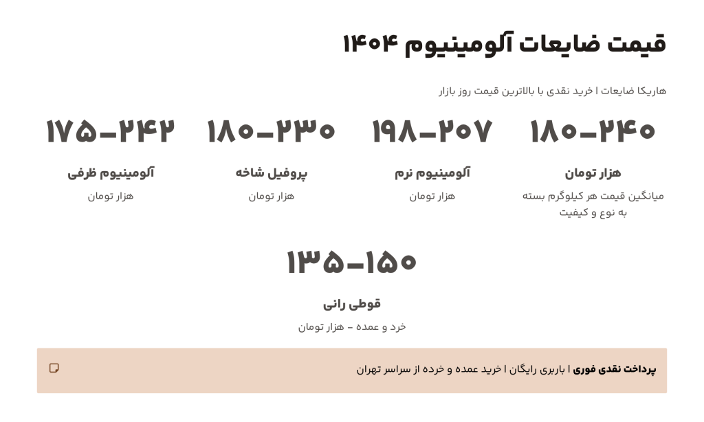 - آلومینیوم ظرفی: در محدودهی ۱۷۵ تا ۲۴۲ هزار تومان