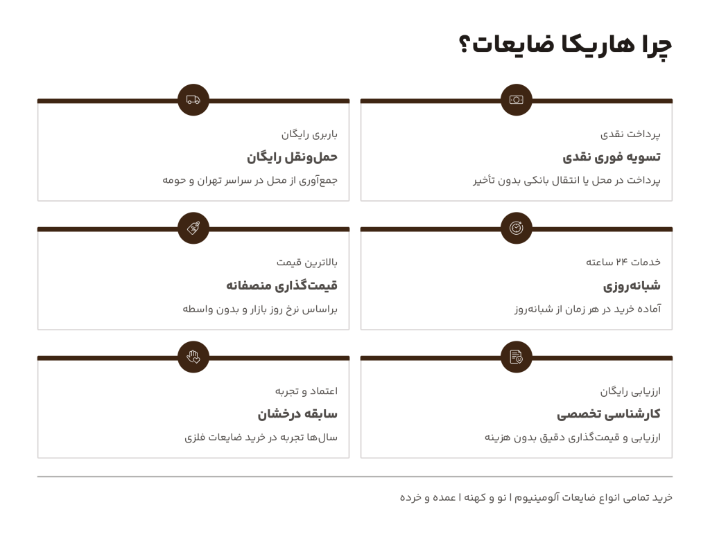 هاریکا ضایعات با تجربهی چندین ساله در خرید و جمعآوری انواع ضایعات آلومینیوم، بهصورت نقدی و بدون واسطه از سراسر تهران و حومه فعالیت میکند.