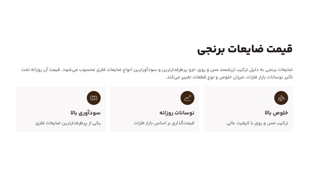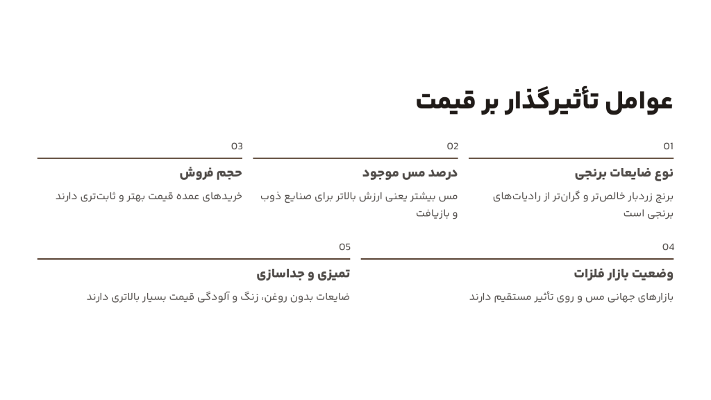 | 6 | ضایعات برنجی روغنی / جرمدار | ۴۰۰,۰۰۰ تا ۵۰۰,۰۰۰ | به دلیل روغن، خاک و جرم زیاد، نیازمند شستشو و تفکیک. |