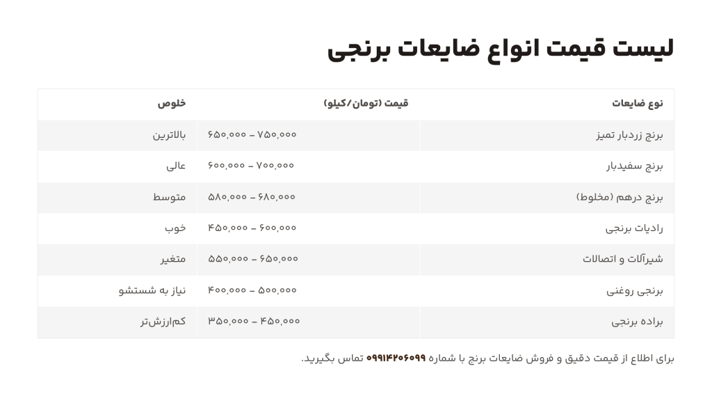 | 1 | ضایعات برنج زردبار تمیز | ۶۵۰,۰۰۰ تا ۷۵۰,۰۰۰ | خالصترین نوع برنج، مناسب ذوب مستقیم، بالاترین قیمت. |