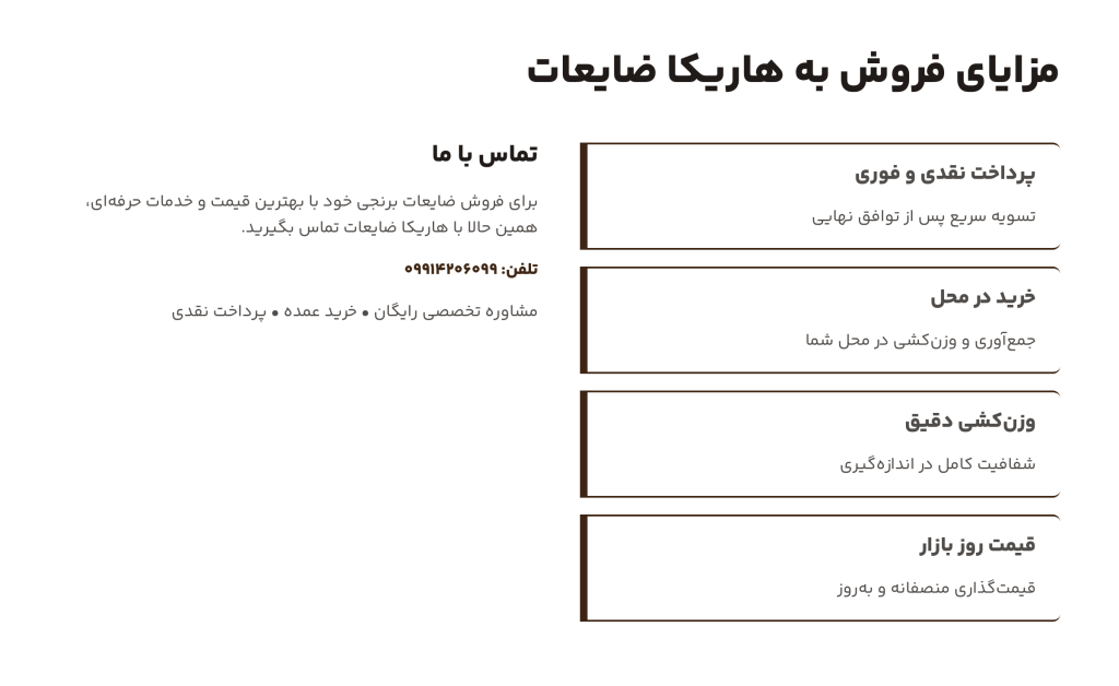 فروش ضایعات برنجی در هاریکا ضایعات برای شما فقط یک معامله نیست؛ بلکه یک همکاری مطمئن، سریع و سودآور است. ما با تجربه، تجهیزات و شبکه وسیع خریداران صنعتی، ضایعات شما را با بهترین شرایط خریداری میکنیم. مهمترین مزایای فروش ضایعات برنجی به هاریکا عبارت است از: